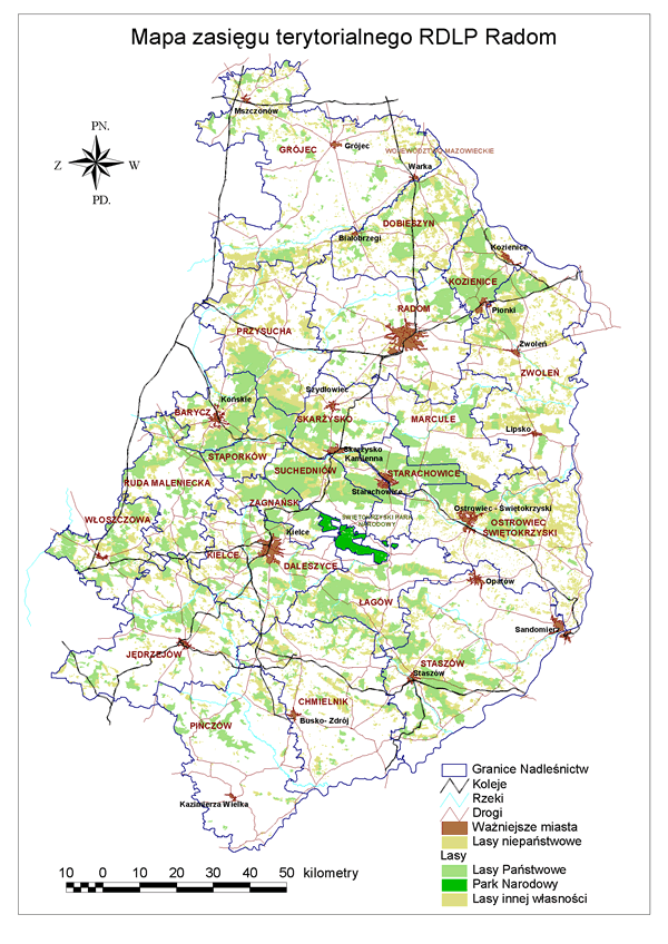 Średnia lesistość Regionalnej Dyrekcji Lasów Państwowych w Radomiu przekracza 26%. Jest bardzo zróżnicowana i waha się od 60% (Puszcza Świętokrzyska) do mniejszej niż 5% (teren Opatowa, Doliny Nidy).